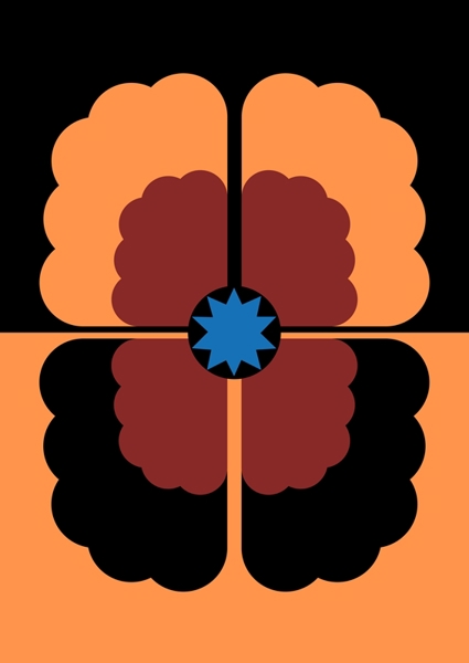 "Geometric Floral Art" poster by Frances Collett. Dive into this geometric floral art that’s all about bold vibes and striking contrasts. Picture this: a flower-like pattern bursting with orange, brown, and black, all anchored by a vibrant blue star at its center. It’s a modern minimalist dream, perfect for jazzing up any living room or office space. This piece doesn’t just sit pretty – it sparks conversation and creativity, making it a must-have for those who appreciate abstract elegance.
