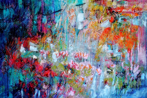 "Immerse in a dream-like tapestry of color and movement with this abstract piece. Inspired by nature's vitality, it merges vibrant blues and fiery oranges to create a dynamic focal point. Perfect for modern or bohemian interiors, it adds energy and depth to any living space."
