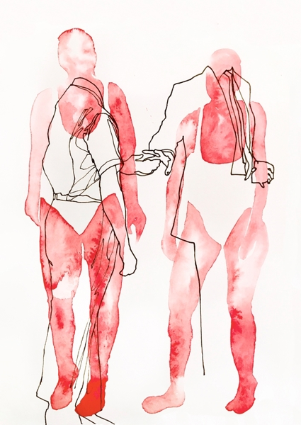 "This abstract piece explores human connection through minimalist lines and vibrant watercolor. Perfect for modern, Scandinavian, or eclectic interiors, it adds a splash of emotion and conversation to living rooms or creative spaces."