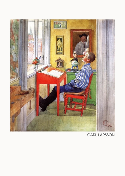 "Esbjorn Doing His Homework " poster by Carl Larsson. A glimpse into a cozy world where focus meets charm. This artwork by Carl Larsson captures Esbjörn, deep in thought at his homework station, bathed in warm light. The vibrant colors and playful details—like the little doll and the view outside—bring a nostalgic vibe that feels both timeless and fresh. Perfect for adding a touch of warmth and character to any space, this piece is a celebration of everyday life that invites you to pause and reflect.