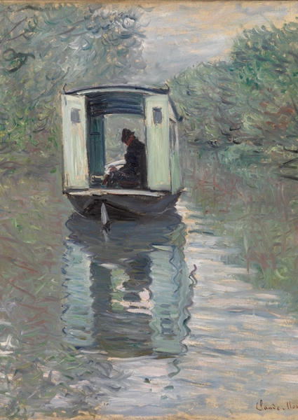 "The Studio Boat (Le Bateau Atelier) by Claude Monet depicts his floating studio, highlighting his plein-air technique. With serene water reflections, the painting reflects Monet's innovation and deep bond with nature."