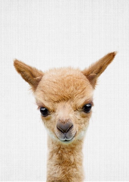 "This adorable alpaca portrait captures innocence and playfulness, making it a perfect addition to modern or rustic interior designs. Its warm tones and minimalist background bring a sense of joy and tranquility, ideal for living rooms or children's spaces."
