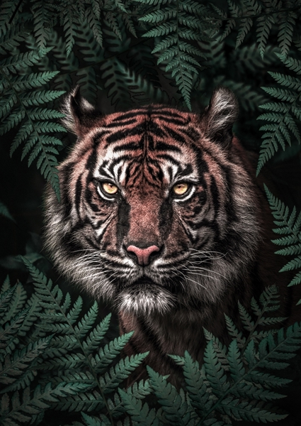 "Jungle Majesty" poster by Ariz Rab. This artwork showcases a tiger's intense gaze, framed by lush green ferns that whisper secrets of the jungle. The vivid stripes contrast beautifully with the deep foliage, creating a striking wildlife portrait that’s hard to ignore. It’s all about that raw power and elegance, right? Perfect for adding a touch of intrigue to any space, this piece transforms walls into windows to the wild. A must-have for nature lovers and modern decor enthusiasts alike!