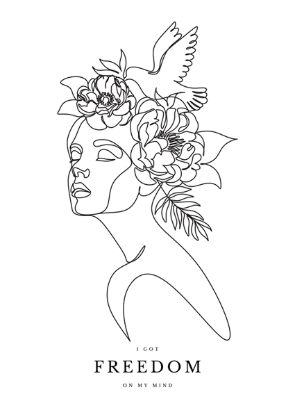 "🕊 Freedom starts within – „I Got Freedom on My Mind“ captures inner strength and lightness. The delicate one-line drawing blends floral details with an elegant female portrait and a rising dove – symbolizing self-empowerment and new beginnings. Perfect for those who love art with meaning."