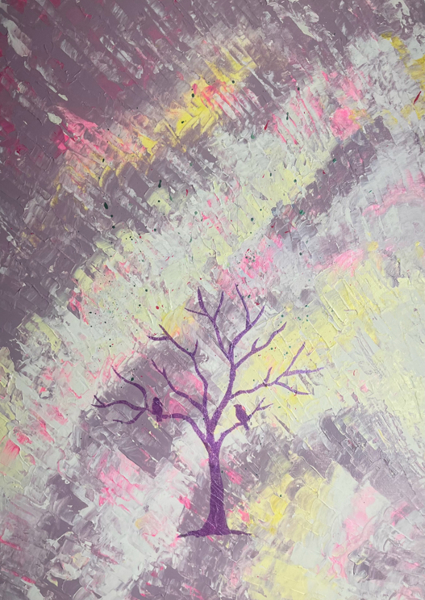 "A quiet transition from day to night is captured in this painting, where the sky is draped in calm purple tones, blended with soft pinks and a hint of yellow. The tree, with its simple silhouette, stands as a silent guardian against this harmonious color palette."