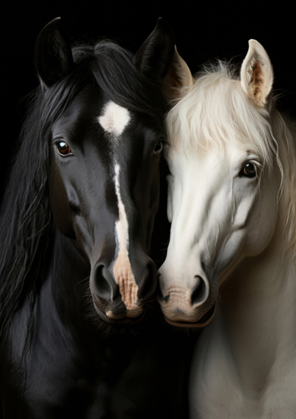 "Black and White Horses 2" poster by Bilge Paksoylu. Two majestic horses, one black and one white, stand side by side, their striking features illuminated against a dark backdrop. The contrast between their coats creates a captivating visual harmony, embodying freedom and grace. This artwork is perfect for nursery or children's spaces, sparking imagination and wonder. With its bold black-and-white aesthetic, it effortlessly blends modern art with a playful touch, making it an ideal addition to any contemporary decor.