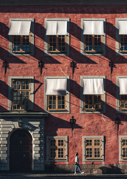 "Late afternoon in Riddarholmen, where geometry and golden light dance quietly across façades of timeworn charm. The rhythm of the windows, the crisp shadows, and a lone passerby — all woven into a still frame of urban poetry. A moment where architecture breathes."