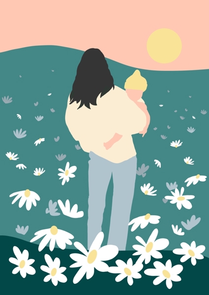 "Motherhood is more than just holding – it’s about showing the world. This minimalist illustration captures that moment: a mother and child on a wildflower meadow, marveling together, deeply connected. A perfect piece for anyone celebrating the beauty of life and family in a fresh, modern way."