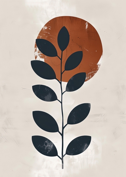 "Sunny Leaves" poster by AI Art Posters. A striking blend of nature and modern design, this artwork features a bold, dark leaf silhouette against a warm, earthy circle. The minimalist aesthetic pops against a soft, neutral background, making it a perfect statement piece for any space. Available as a poster or framed fine art print, it effortlessly elevates your personal art gallery. Embrace the vibe of contemporary nature with this eye-catching piece that speaks volumes without saying a word.