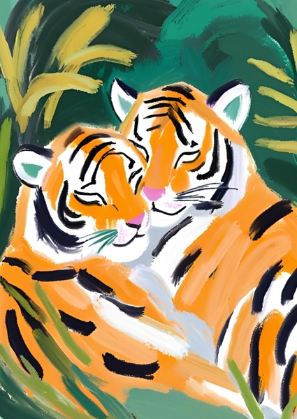 "Art print ‘Tigers in love’ by OHKIMIKO. Available in various sizes as a poster or framed fine art print. Together with a frame, this artwork will really stand out in your own personal art gallery"