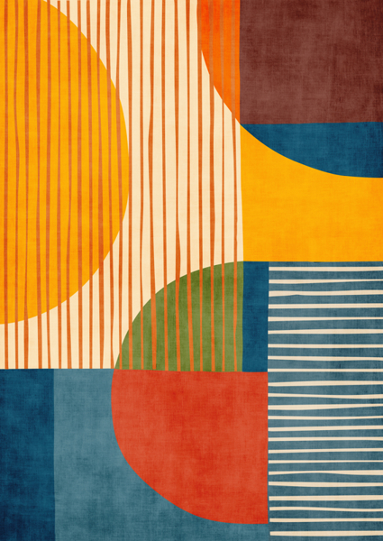 "Abstract Artwork in Mid-Century Modern Color Palette featuring Circles, Stripes and rectangles in a balanced composition."