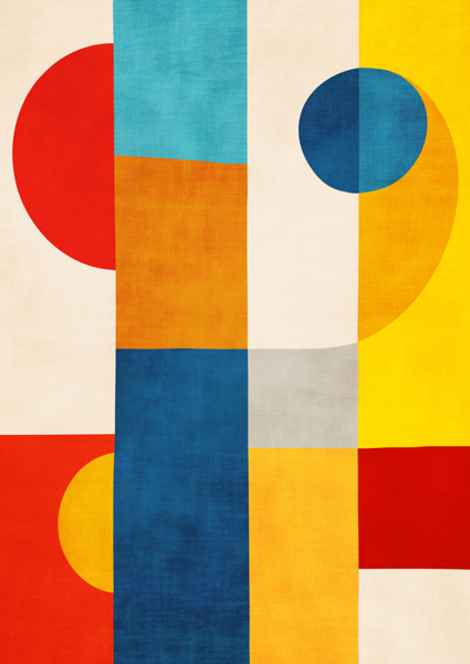 "Colorful Modern Bright Art" poster by EmcDesignLab. Dive into a world of color with this abstract geometric artwork. Bold reds, sunny yellows, and deep blues collide in a playful dance of shapes. The textured background adds depth, inviting touch and intrigue. It’s modernism with a twist – simple yet striking, minimalist yet vibrant. Perfect for those who crave a splash of personality in their space. This piece isn’t just art; it’s a conversation starter, a burst of joy on your wall.