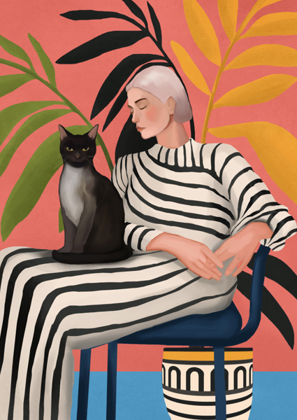 "The Cat and the Calm" poster by City Art. A tranquil scene unfolds with a serene woman and her sleek black cat, both exuding elegance. The bold, tropical leaves pop against a warm backdrop, while graphic stripes add a modern twist. This artwork captures that perfect moment of stillness—just the two of them, no words needed. Ideal for those who appreciate chic interiors and the quiet companionship of a feline friend. It’s a stylish nod to calm vibes and connection, perfect for any space.