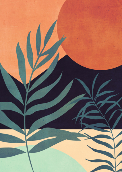 "Abstract artwork with geometric shapes, featuring bold colors of orange and teal. A stylized landscape with large sun, minimalist plant silhouettes, and a serene composition. Perfect for modern wall art or nature-themed decor inspiration."