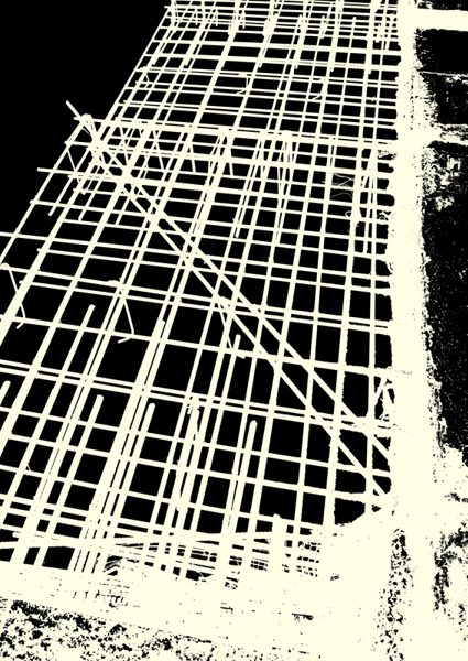 "Abstract artwork featuring a monochrome grid pattern, evoking a sense of modern architecture and minimalism. The intersecting lines create dynamic tension, highlighting industrial design and geometric precision."