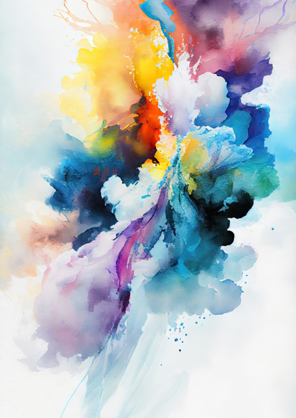 "This abstract watercolor art features vibrant splashes of color, blending blue, yellow, orange, and purple hues. The dynamic flow creates a sense of motion and energy, evoking a dreamy and ethereal atmosphere. Perfect for contemporary art lovers."