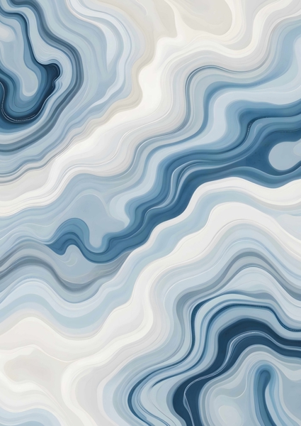 "This abstract artwork features fluid, organic lines in shades of blue and white, resembling natural marble waves. Its soothing flow and elegant color palette evoke a sense of calm, ideal for contemporary and modern interior design themes."
