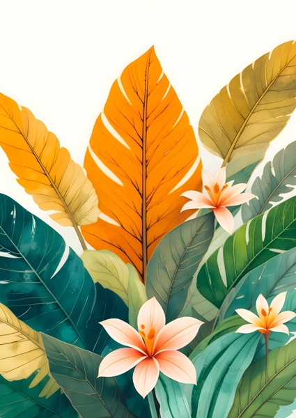 "Vibrant botanical artwork featuring lush tropical leaves and delicate flowers. The colorful foliage in hues of orange, green, and teal creates a serene nature-inspired design, perfect for modern decor themes and botanical illustrations."