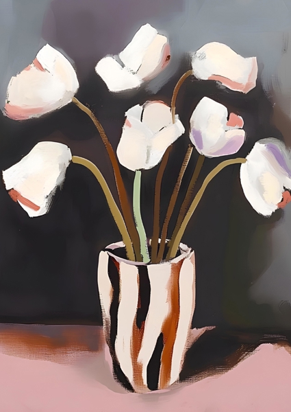 "Contemporary floral artwork featuring white tulips in a striped vase against a dark backdrop. The blend of modern and abstract styles enhances its aesthetic appeal, making it a striking piece for interior decor."
