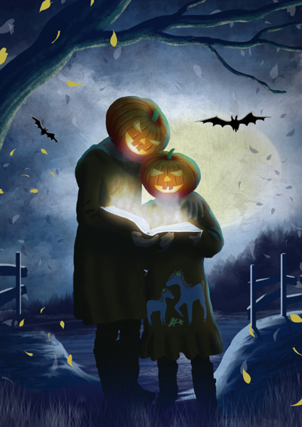 "This enchanting Halloween artwork depicts pumpkin-headed figures reading under a moonlit sky. The eerie atmosphere is accentuated by luminous jack-o'-lantern faces, fluttering leaves, and silhouetted bats, capturing the spooky essence of the season."