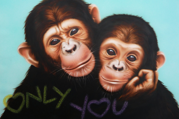 "This artwork features two endearing chimpanzees in a loving embrace against a soft blue background. The vibrant graffiti-style text "Only You" adds a playful and affectionate touch, perfect for wildlife art and animal lovers."