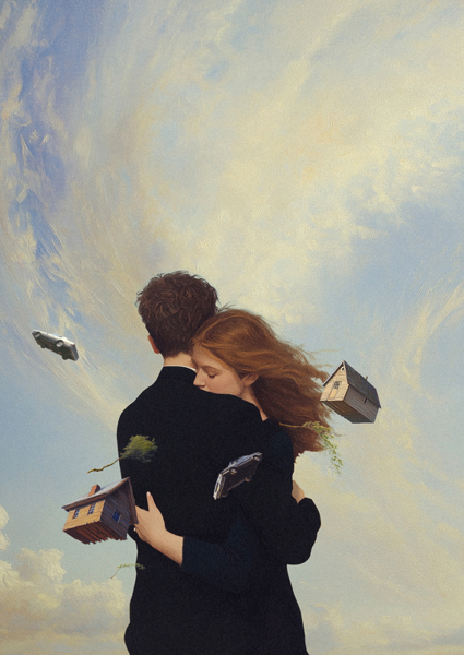 "Our love ended the war" poster by Fran Rodríguez. A surreal embrace unfolds in this digital collage, where love transcends the ordinary. Two figures, locked in a tender hug, float amidst a dreamy cosmos, with whimsical houses and cars drifting around them. It’s a nostalgic nod to romance, blending retro vibes with a psychedelic twist. The soft colors and ethereal clouds evoke a sense of longing and connection, making it a perfect piece for those who believe love can indeed end wars. Dive into this enchanting world where emotions and the cosmos collide.