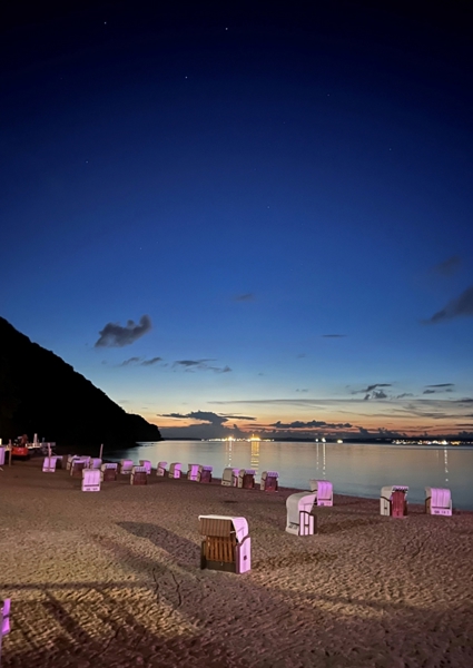 "Rügen" poster by Anna Nilsson Pumplun. Experience the tranquil beauty of Rügen's Ostseebad Sellin at dusk. This artwork captures a serene beach scene, where soft twilight hues blend seamlessly with the calm waters of the Baltic Sea. The iconic beach chairs, bathed in gentle light, invite relaxation and reflection. A perfect moment frozen in time, it whispers of warm August evenings and the allure of Germany's largest island. Ideal for those who crave a slice of coastal serenity.
