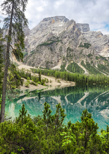 "Ein idyllischer Bergsee liegt still eingebettet zwischen den schroffen Felswänden"