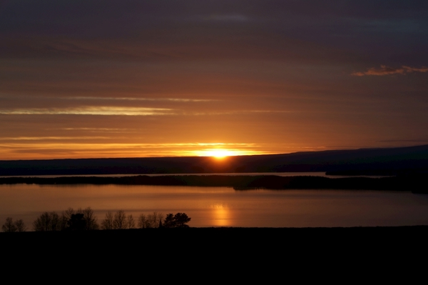 "Sunset over Storsjön" poster by Linnea Mattsson. A breathtaking sunset unfolds over Lake Storsjön, casting a warm glow that dances on the water's surface. The horizon is a canvas of deep oranges and subtle purples, inviting a moment of reflection. Nature's palette here is pure magic – the kind that makes you want to pause and soak it all in. This artwork captures the serene beauty of Sweden's Jämtland region, where every sunset feels like a whispered secret from the universe. Perfect for those who crave a touch of tranquility in their space.