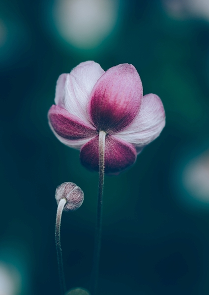 "From behind" poster by Emma Busk Winquist. A stunning glimpse into the world of autumn anemones, this artwork captures the delicate beauty of flowers from an unexpected angle. The soft pink and white petals create a gentle contrast against a blurred background, inviting viewers to appreciate the often-overlooked details. A budding companion stands nearby, hinting at the cycle of life in a garden inherited from the artist's parents. Perfect for those who cherish nature's subtleties and the stories they tell.
