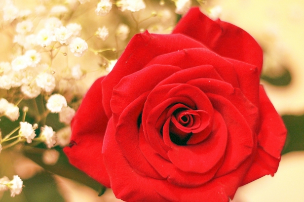 "Red rose" poster by Karin Johansson. A stunning red rose, the ultimate symbol of love, stands out against a delicate backdrop of tiny white flowers. Its velvety petals spiral inward, exuding a sense of passion and elegance. This artwork captures a moment of affection, a bouquet gifted with heartfelt intentions. Perfect for adding a touch of romance to any space, it invites admiration and evokes memories of love shared. A timeless piece that speaks volumes without saying a word.