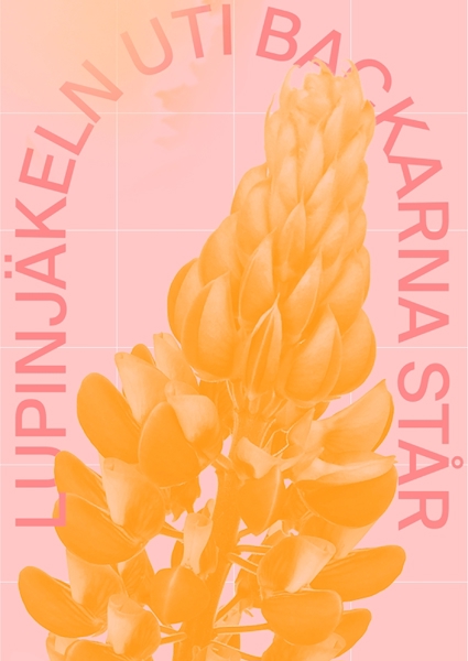 "LUPIN #2" poster by Johan Emil. A vibrant yellow lupine bursts against a playful pink backdrop, making a bold statement. The text "LUPINJÄKELN UTI BACKARNA STÅR" dances around the flower, merging nature with a modern twist. It’s like a botanical selfie, capturing the essence of flora in a graphic design moment. Perfect for those who appreciate the clash of organic beauty and contemporary style. This piece is a must-have for anyone looking to add a splash of color and creativity to their space.
