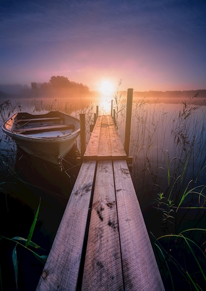 "Sunrise lit boat" poster by Niklas Twilling. A serene scene unfolds as a wooden dock stretches toward a glowing sunrise, casting a warm light over a misty Swedish landscape. The boat, nestled at the edge, seems to whisper stories of tranquil mornings and quiet adventures. Fog dances around the reeds, creating an ethereal atmosphere that invites contemplation. This artwork captures the essence of nature's beauty—where every detail, from the soft hues to the leading lines, draws the eye straight into the heart of the moment. Perfect for those who appreciate the magic of dawn.