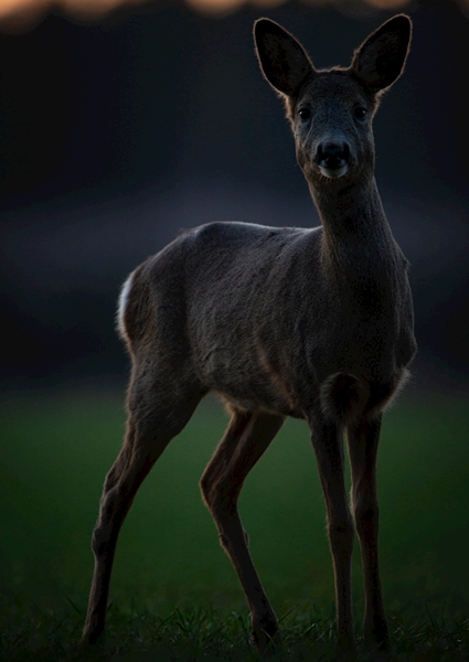"young roedeer" poster by Erik Eklund. A young roedeer stands poised against a fading sunset, capturing that perfect moment of curiosity and innocence. The silhouette contrasts beautifully with the soft twilight, highlighting its delicate features. It’s nature’s own snapshot of wonder – a fleeting glimpse into the wild. This artwork invites viewers to pause and appreciate the beauty of the natural world, evoking a sense of calm and connection. Perfect for animal lovers and nature enthusiasts alike.