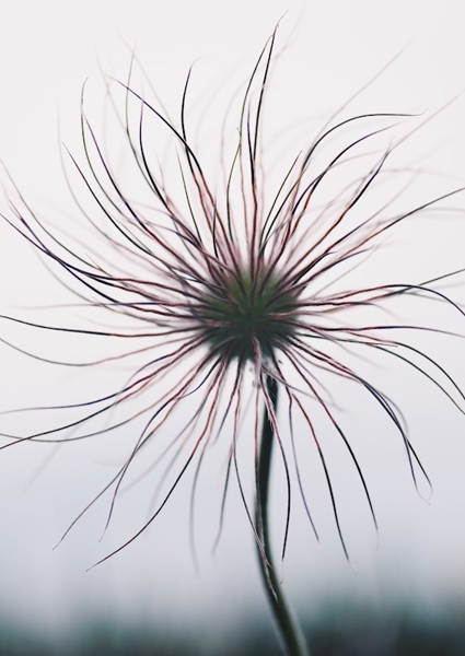 "Pasqueflower" poster by Ewa Bladh. A stunning macro shot of a pasqueflower, captured in soft backlight, reveals its intricate, stylized seed position. The delicate strands radiate outward, creating a whimsical, almost cosmic vibe. With a minimal color palette, this artwork embodies the essence of nature’s elegance. Perfect for those who appreciate the beauty in simplicity and the art of botany. A piece that whispers stories of springtime in Skåne – a true conversation starter for any space.