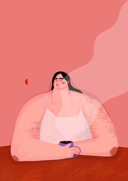 "Coffee" poster by Oh.Ofi by The Artcircle. This artwork captures a moment of morning contemplation – a woman, coffee in hand, exudes a vibe that’s both grumpy and effortlessly cool. The soft pink backdrop contrasts with her bold presence, showcasing her tattoos and relaxed posture. It’s like she’s just had her first sip, ready to take on the day, or maybe just savoring the quiet. Perfect for anyone who appreciates the beauty in everyday moments, this piece is a playful nod to coffee culture and self-expression.