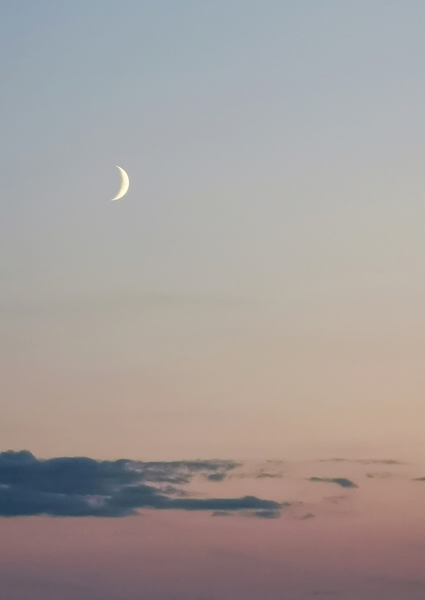 "Moon in sunset" poster by Sulo. A crescent moon hangs delicately in a pastel sky, casting a serene glow over the horizon. The soft pink and blue hues blend seamlessly, evoking a tranquil sunset vibe. Wispy clouds drift lazily, adding depth to this dreamy scene. It's like a moment frozen in time—perfect for those who crave a slice of nature's beauty. Ideal for anyone looking to bring a touch of calm and wonder into their space.
