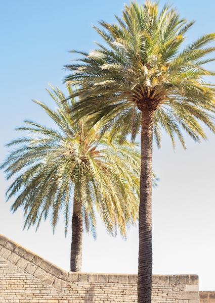 "Palma de Mallorca " poster by sofia winghamre. Two palm trees stretch skyward against a dreamy blue backdrop, their fronds swaying gently in the breeze. Nestled beside an antique stone wall, this scene captures the essence of Palma de Mallorca – a blend of nature and history. The juxtaposition of the lush greenery and the weathered stone speaks to the timeless charm of the city. Perfect for those who crave a slice of Mediterranean vibes in their space.