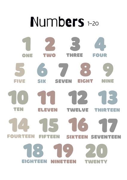 "Kids numbers 1-20 Poster" poster by Viktor Håkansson. Brighten up any child's space with this playful poster featuring numbers 1-20 in a delightful array of colors and sizes. Each digit pops with personality, making counting a fun adventure. Perfect for little learners, this artwork transforms the mundane into a vibrant experience. It's not just a poster – it's a colorful gateway to numeracy, inviting kids to explore the world of numbers with joy and curiosity. Ideal for nurseries, playrooms, or classrooms!