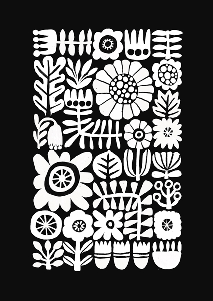 "Floral Tetris - Black & White" poster by Trine Tollefsen. A playful dance of hand-drawn retro flowers unfolds in this black and white masterpiece. Each bloom is meticulously organized, creating a stylish, minimalist vibe that feels both nostalgic and fresh. The bold contrasts pop against the deep backdrop, making it a striking addition to any space. Perfect for those who appreciate elegance with a twist, this artwork captures the essence of mid-century charm while keeping it effortlessly modern. A floral Tetris that’s just waiting to brighten up your walls!