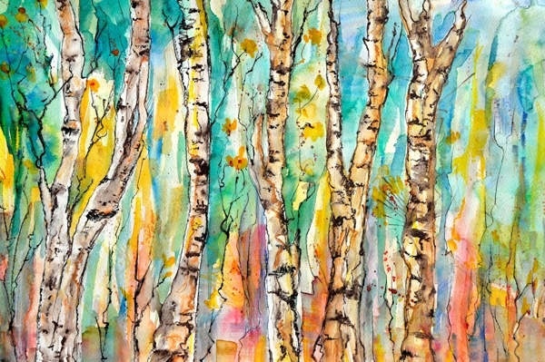 "summer mood in the birch forest, lots of color and sunlight captured in an abstract watercolor"
