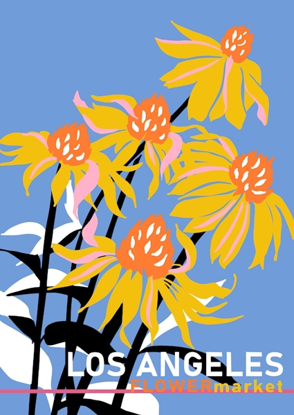 "Flower Market Los Angeles" poster by DESIGN d´annick. Bold and vibrant, this artwork captures the essence of Echinacea in a playful, graphic style. Set against a striking blue backdrop, the yellow blooms pop with energy, embodying the lively spirit of Los Angeles. It’s a modern botanical illustration that feels both fresh and nostalgic—perfect for those who appreciate a touch of urban flair in their decor. Ideal for brightening up any space, this piece is a celebration of floral beauty and city life.